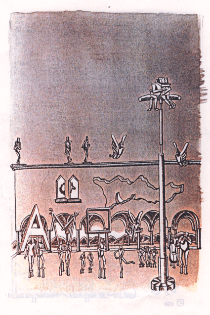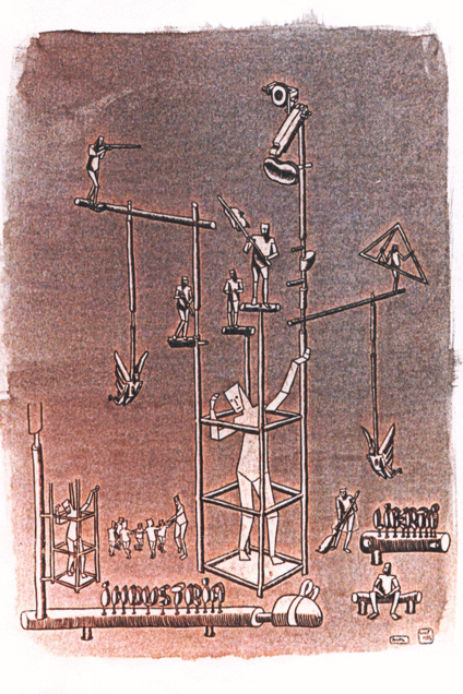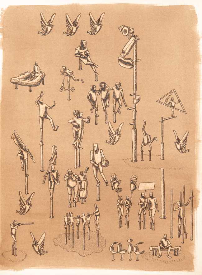 i personaggi: chi spara chi suona chi guarda dall’alto chi pulisce chi fa il girotondo e tutto il meccanismo produce rifiuti chi guarda dal basso chi va in bagno l’operaio stanco e volatili. cagnetti e soli viaggianti